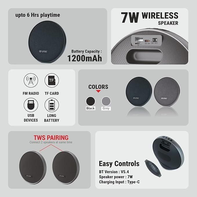 - 🎨 Color Options – Available in Black & GreyExperience compact power with the UNIX Azul XB-U11, a stylish 7W wireless speaker designed for clear, rich sound in a sleek round form. Featuring TWS pairing, you can connect two Azul speakers simultaneously for an immersive stereo experience.With up to 6 hours of playtime, multiple playback options (TF card, USB, FM radio), and Bluetooth v5.4 for stable connectivity, the Azul XB-U11 is perfect for both home and outdoor use. Its 1200mAh battery recharges quickly via Type-C, so you can get back to your music in no time. Available in Black and Grey to match your style.