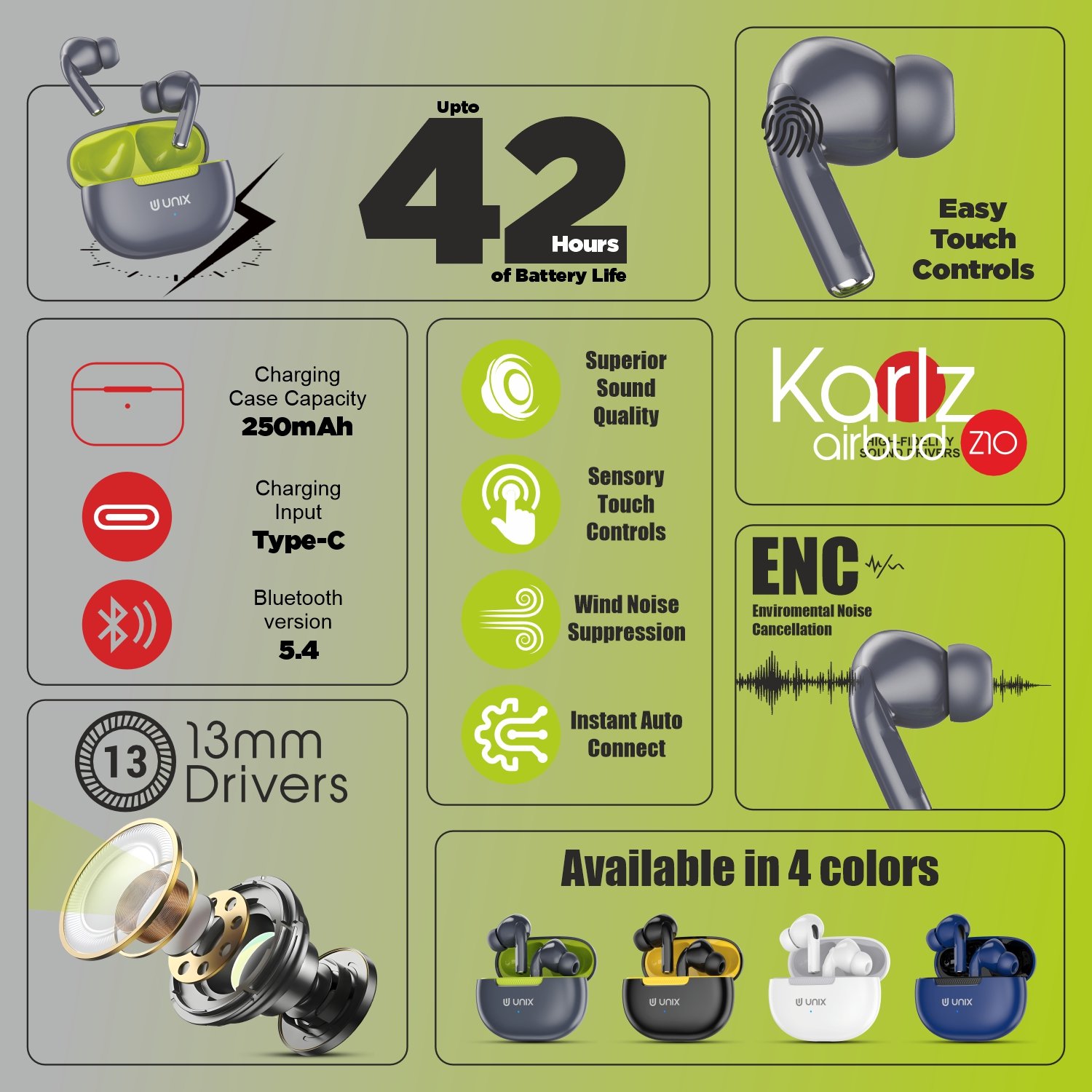 UNIX Karlz Airbud Z10 delivers superior sound performance with 13mm dynamic drivers that provide deep bass and crystal-clear highs.