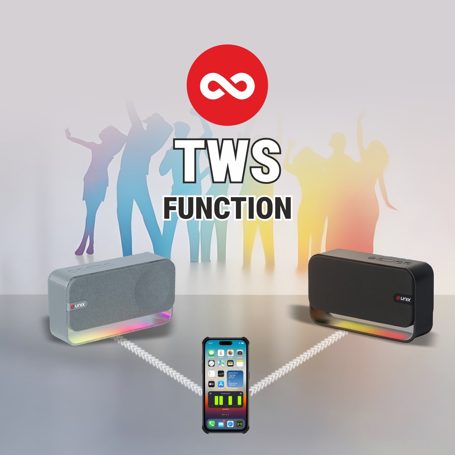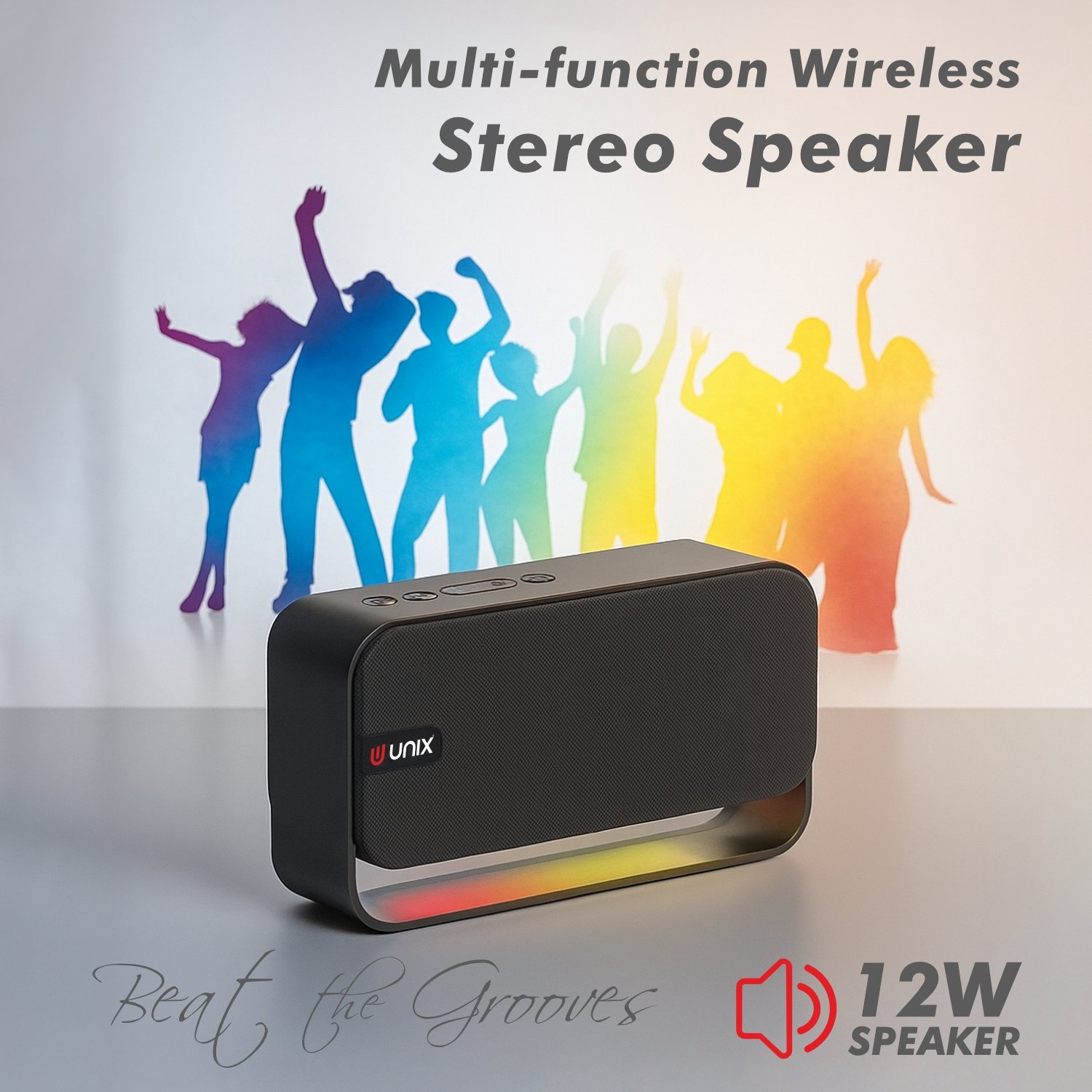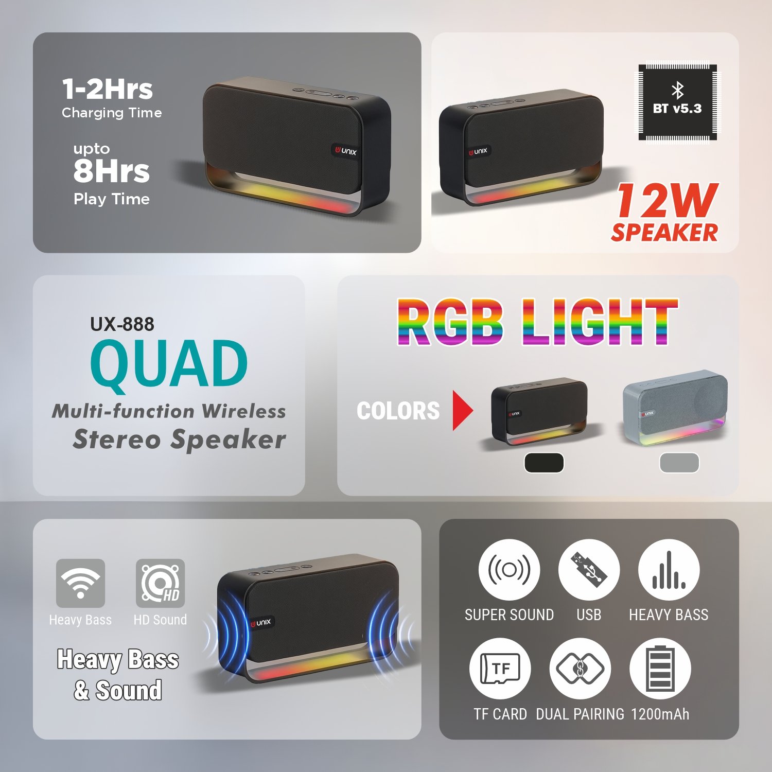 Experience rich stereo sound with the UNIX Quad Wireless Speaker. Designed for power and portability, this 12W RGB speaker brings every beat to life with vibrant lighting and crystal-clear audio.