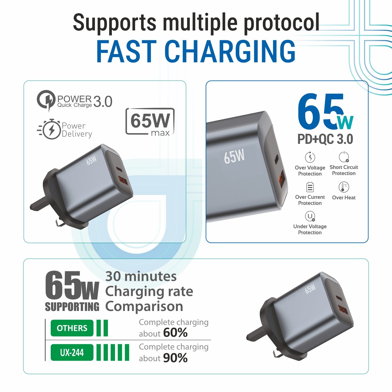 The UNIX UX-244 65W PD + QC 3.0 Charger is engineered to deliver ultra-fast and efficient charging performance for all your devices. With Power Delivery and Quick Charge 3.0 technology, it supports rapid charging across smartphones, tablets, and laptops.