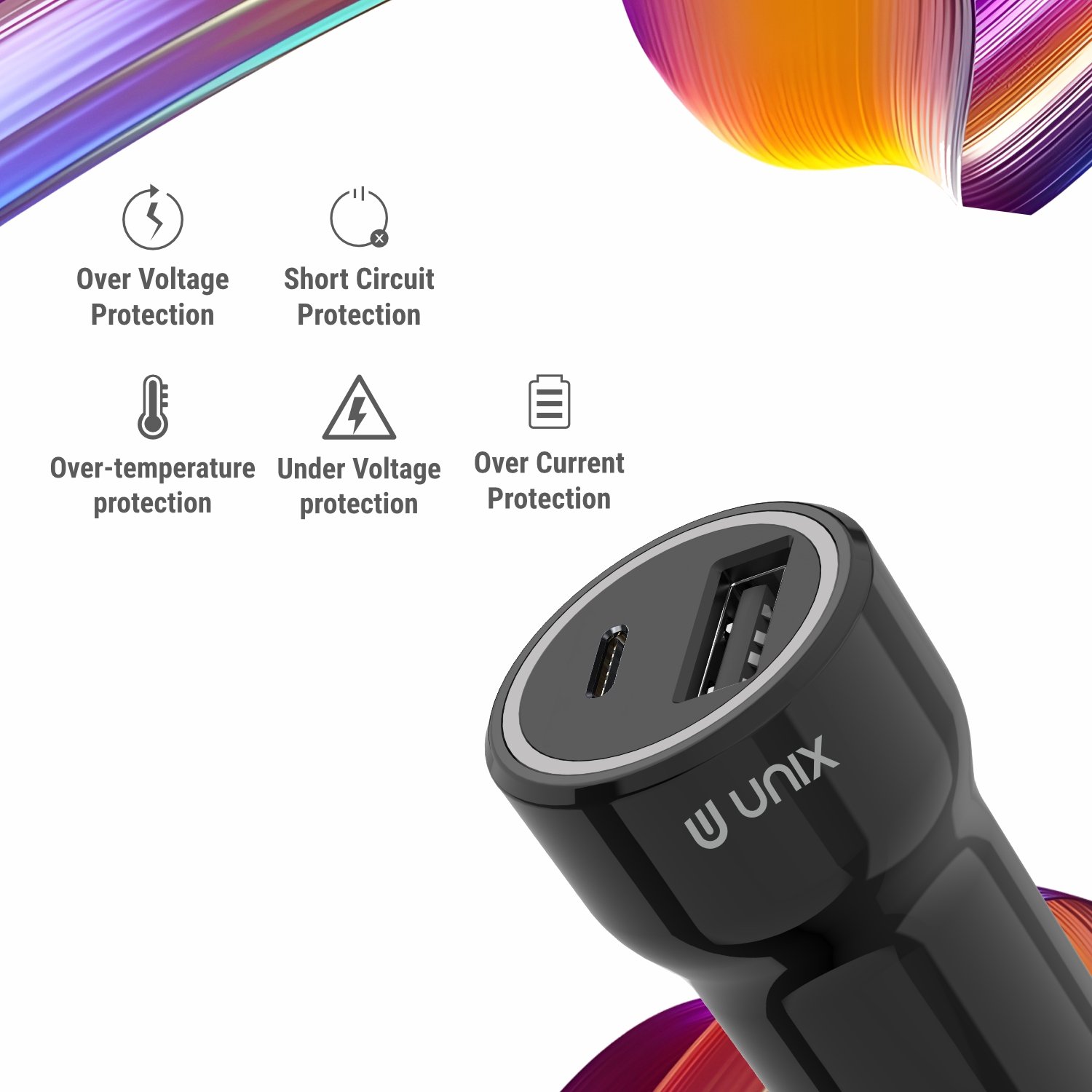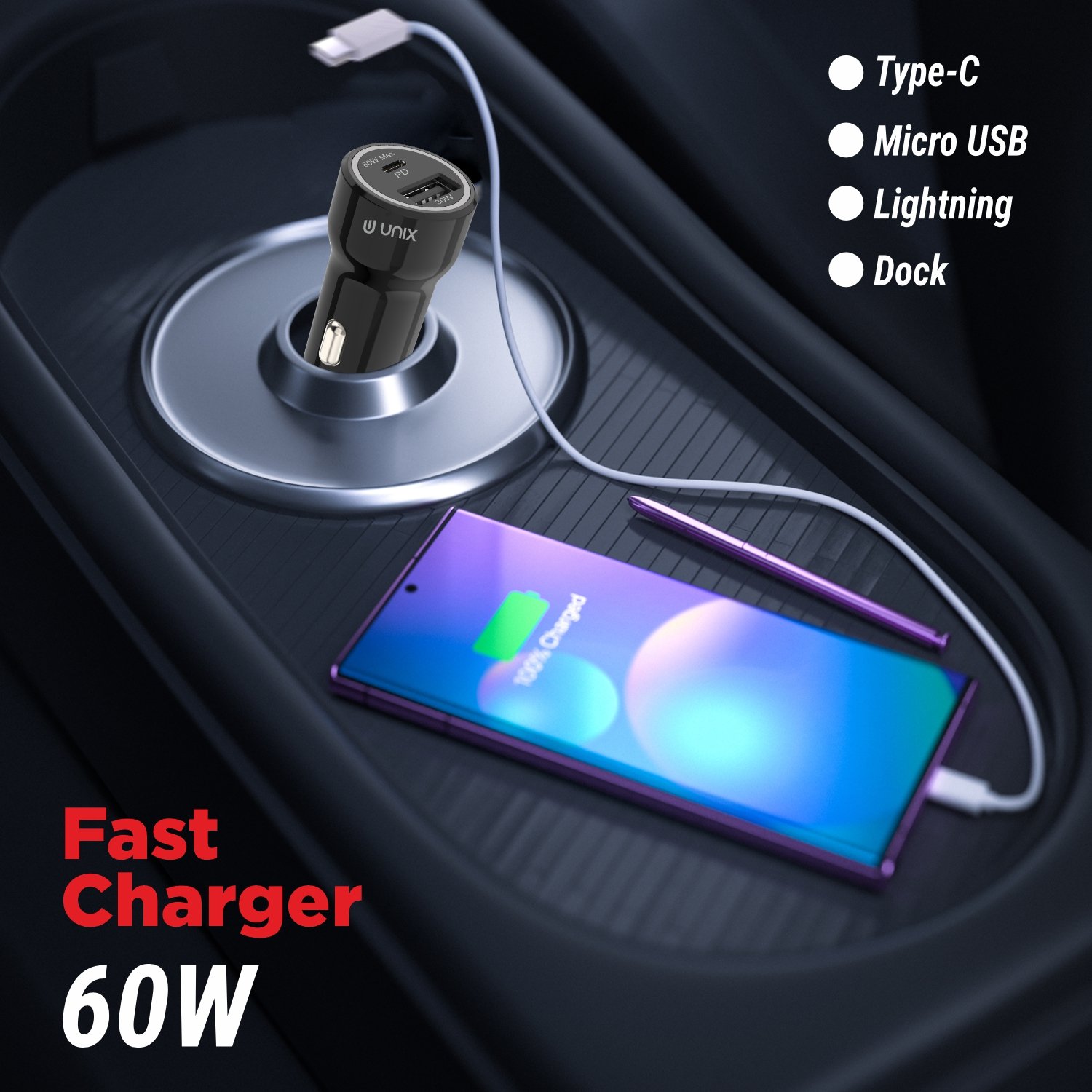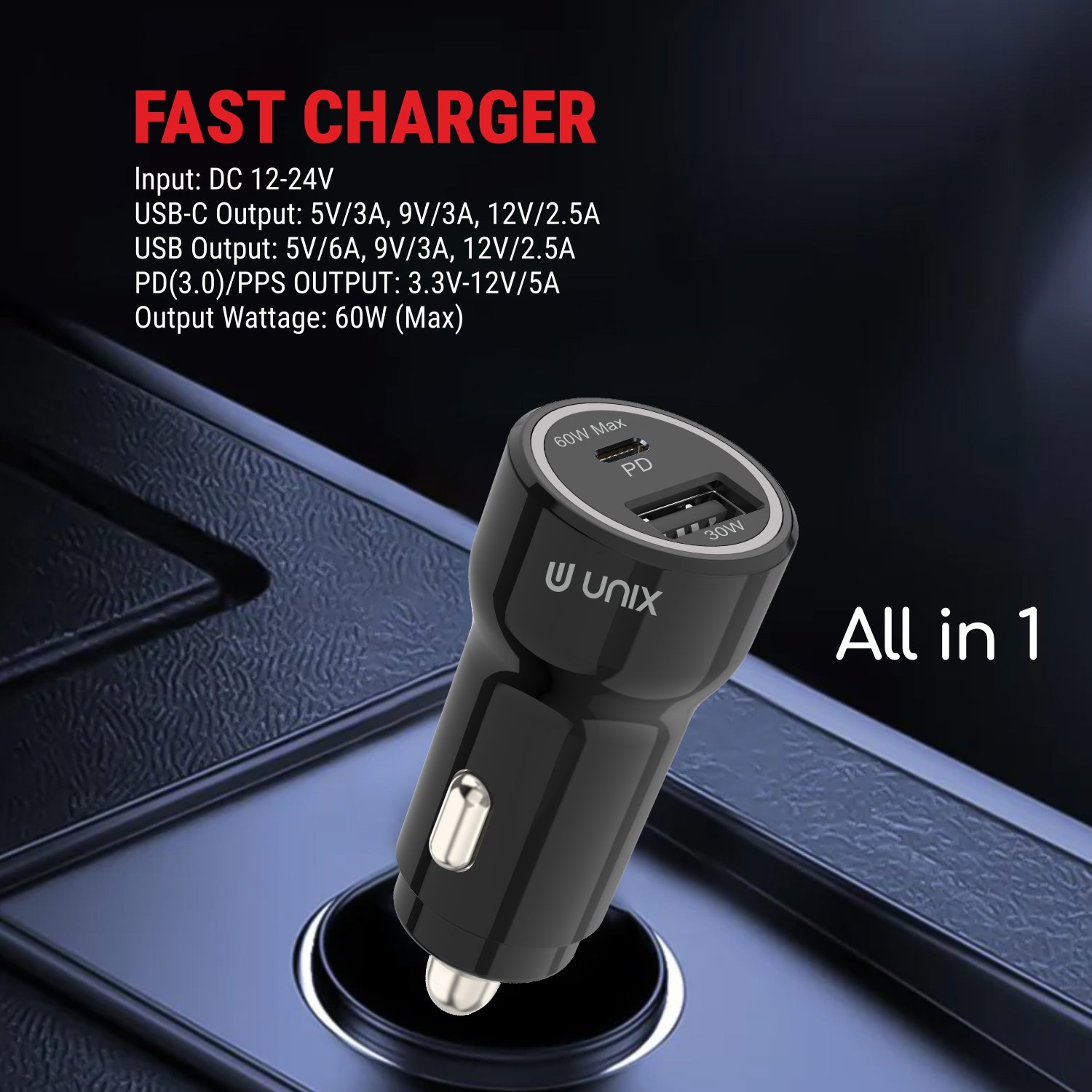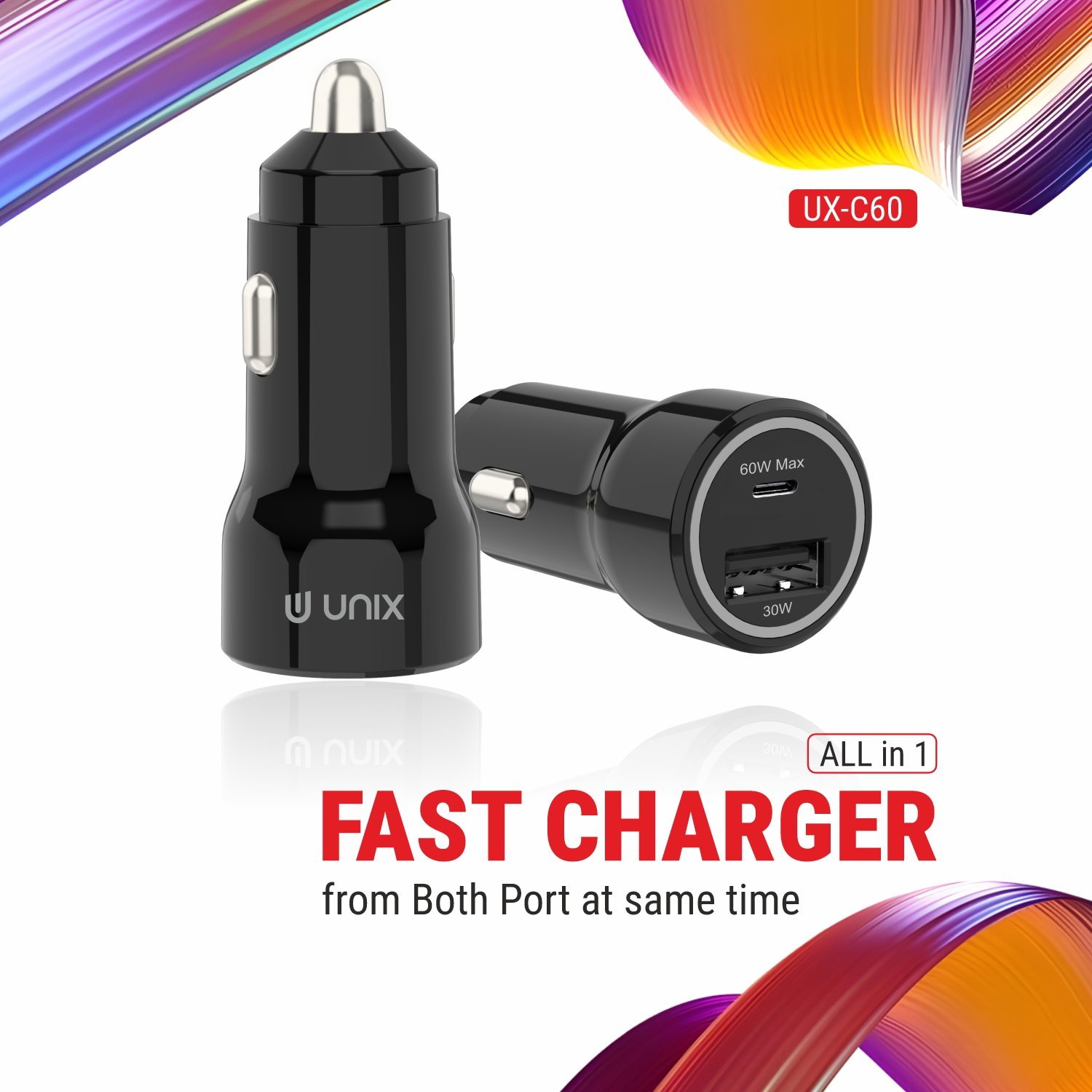 Unix UX‑C60 Super Fast Car Charger – 60W PD + USB Fast Charge All‑in‑One
