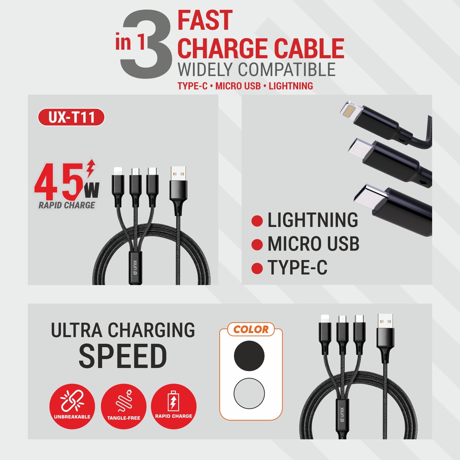 The UNIX UX-T11 is a premium 3-in-1 fast charge cable designed to offer maximum convenience and superior charging performance. With support for up to 45W rapid charging, it can efficiently power up your Type-C, Micro USB, and Lightning devices all at once.
