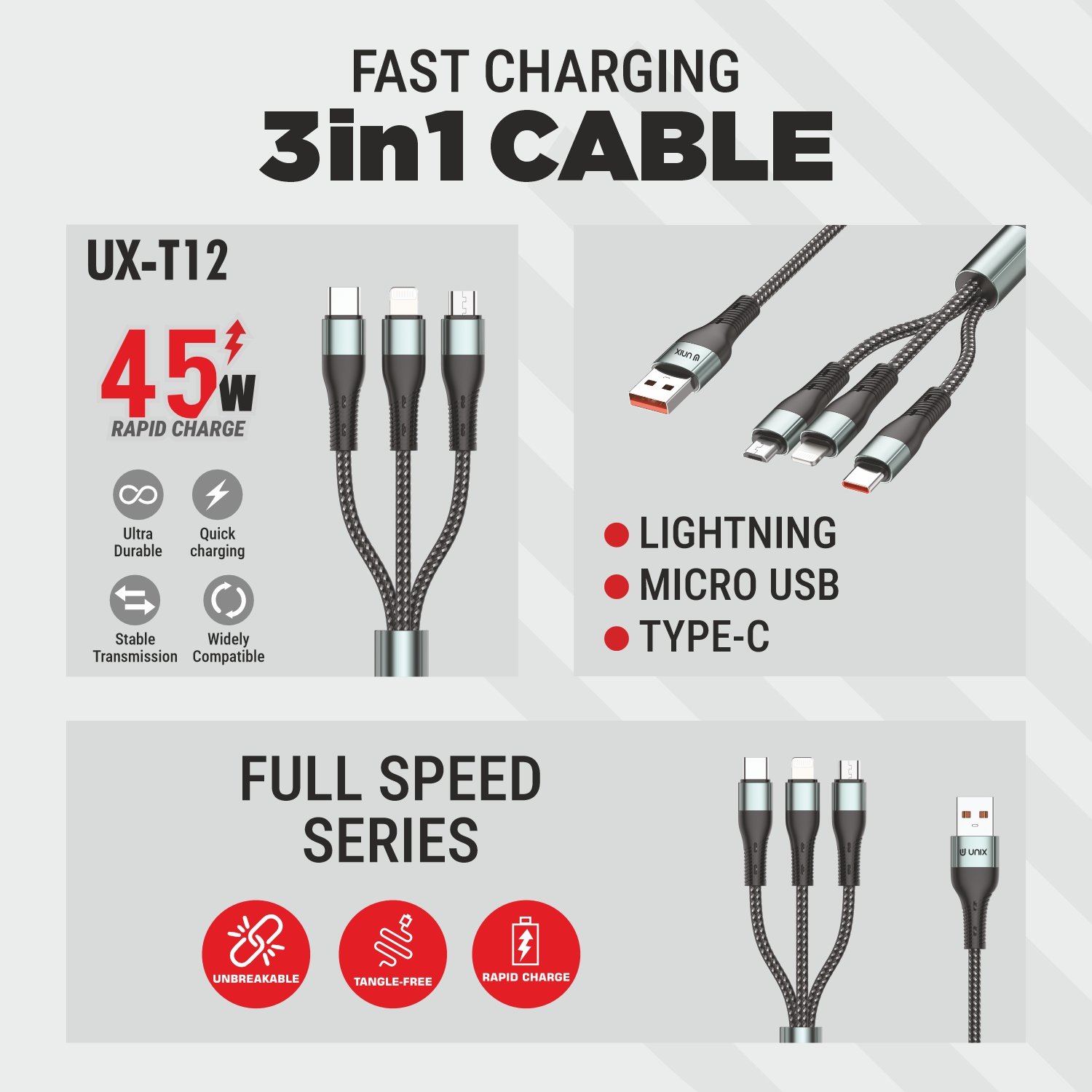 The UNIX UX-T12 is a high-performance 3-in-1 fast charging cable crafted for users who demand speed, durability, and versatility. With support for up to 45W rapid charging, it can power your Type-C, Micro USB, and Lightning devices quickly and safely.