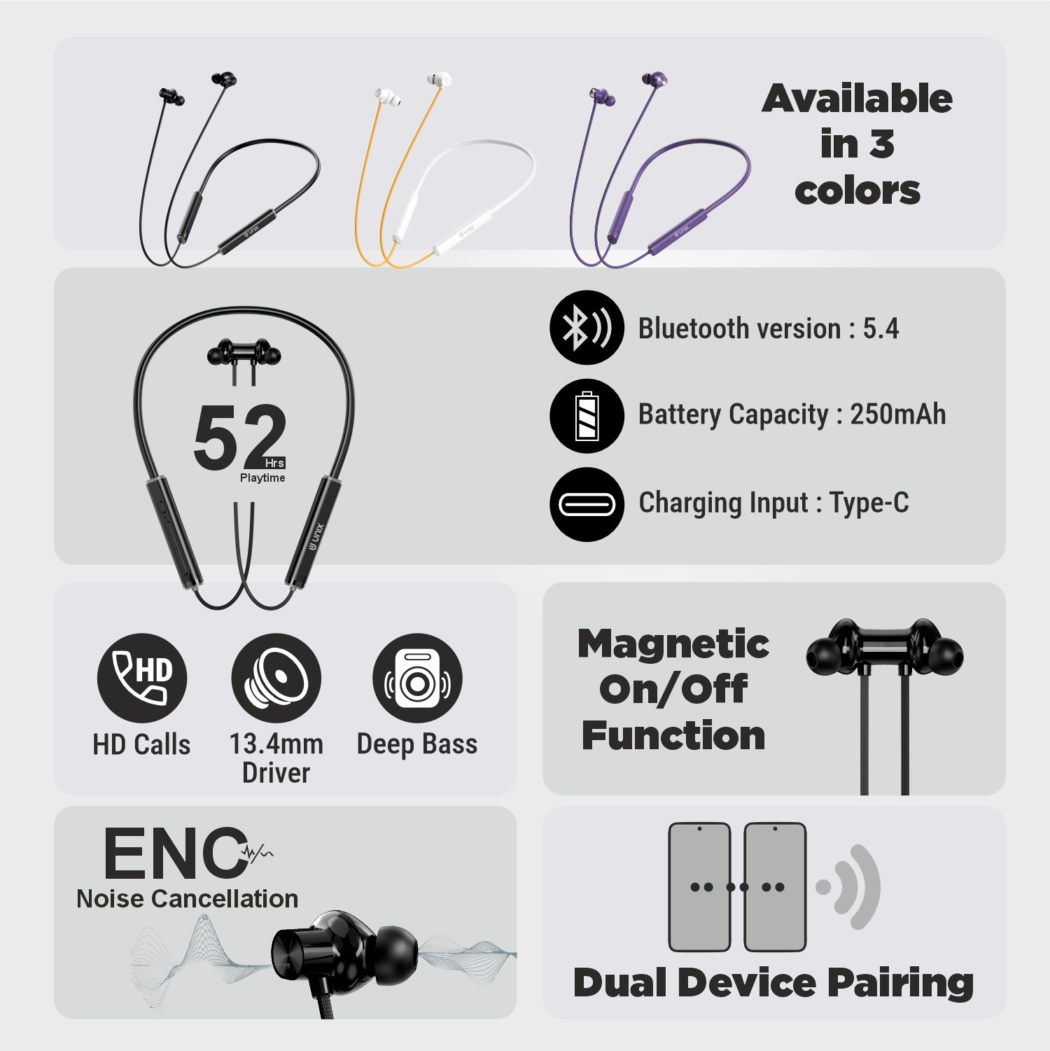 The UNIX Zen 5 Pro (UX-W8) wireless neckband offers powerful sound and long-lasting performance with up to 52 hours of playtime on a single charge.